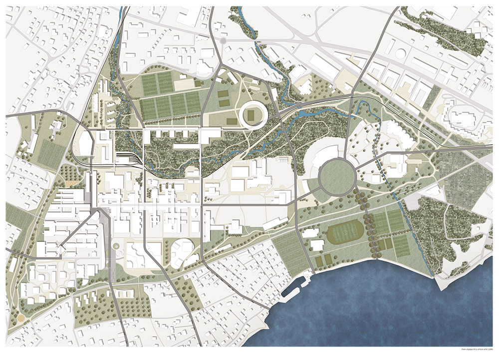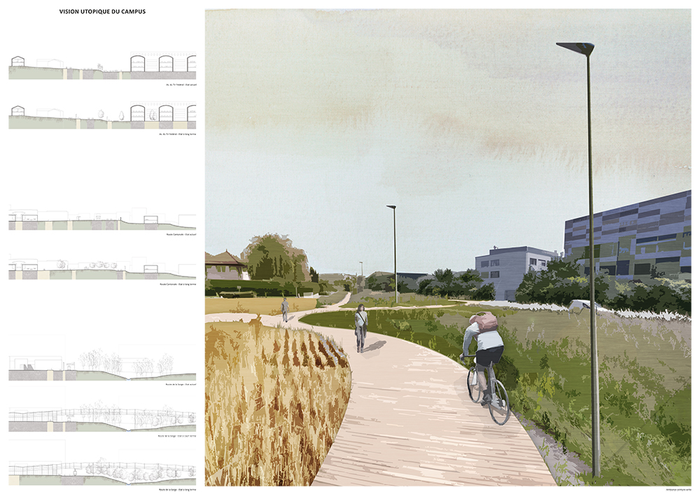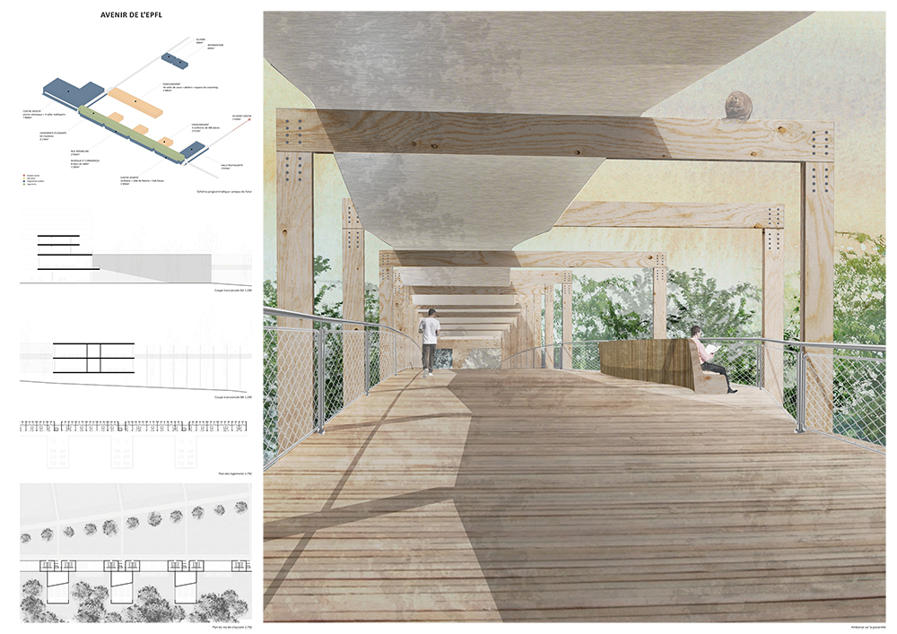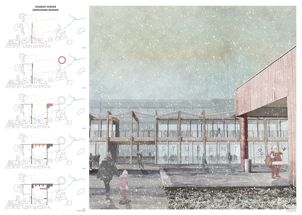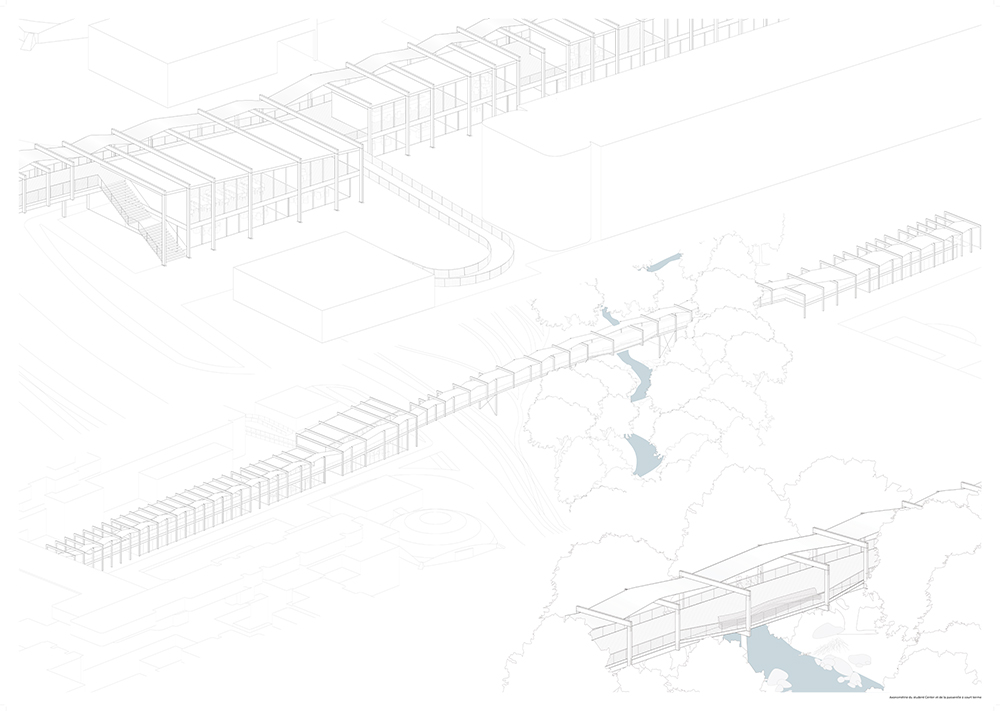 Entre le campus universitaire et son voisinage Ouest lausannois, existe une interface non bâtie. Comment remédier à l’isolement du campus qui est déposé telle une île dans son environnement résidentiel ? L’Agepoly propose un projet innovant pour rassembler en son coeur les personnalités plurielles vivant sur le campus. Notre proposition intègre ce nouveau pôle étudiant dans une ceinture verte qui borde le campus et valorise l’interface comme un nouvel écosystème de rencontre entre universitaires et résidents.