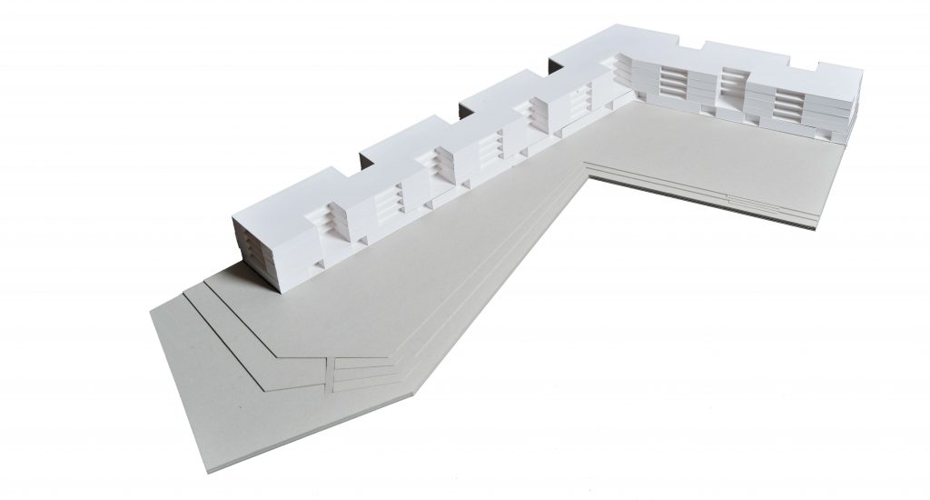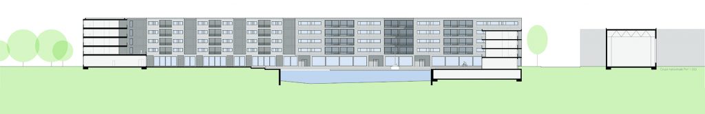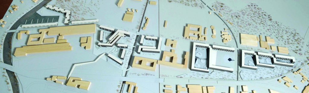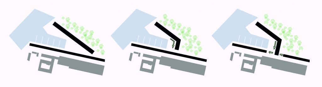 Pour intégrer le projet à son environnement, du côté sud on trouve des barres pour renvoyer l’image des ateliers mécaniques. Au nord, on trouve une barre qui se courbe pour ramener le parc en direction de la ville. L’espace public est voulu comme un espace de rencontre, minéral. L’espace de quartier est plutôt végétal.