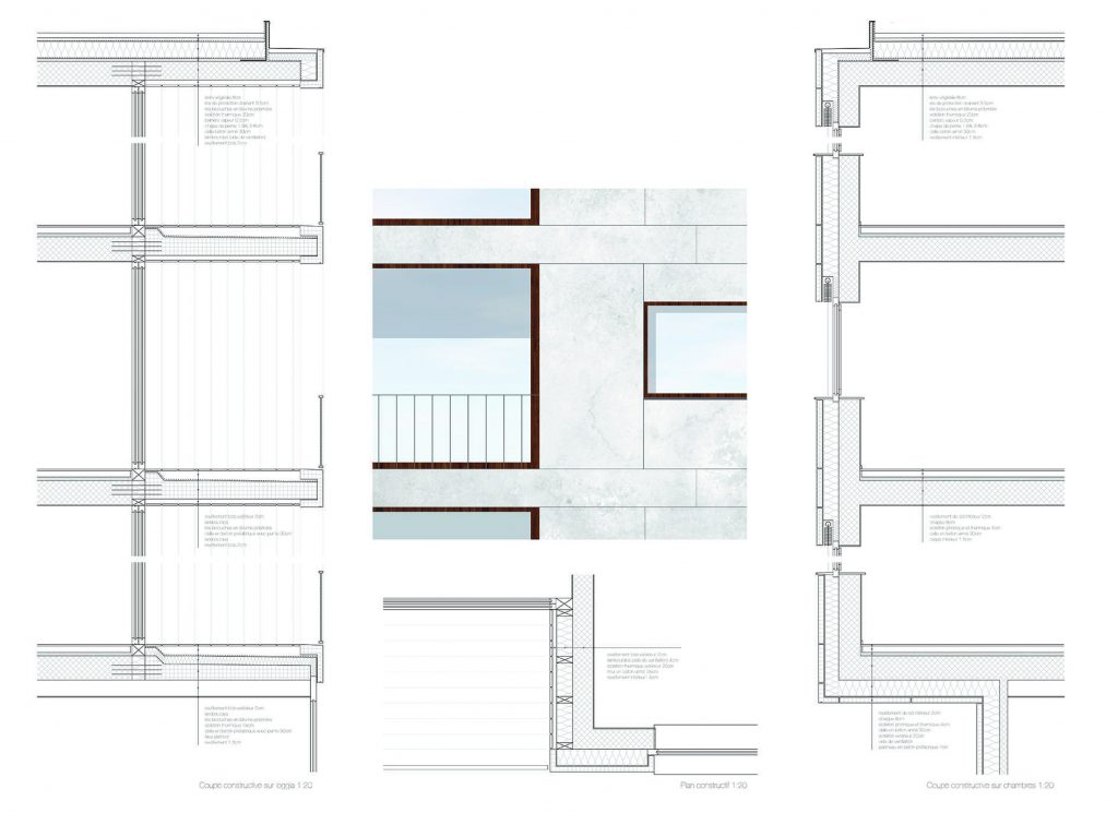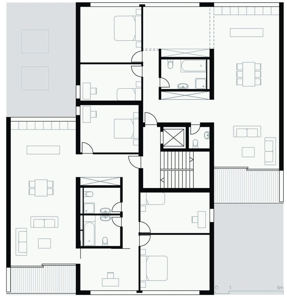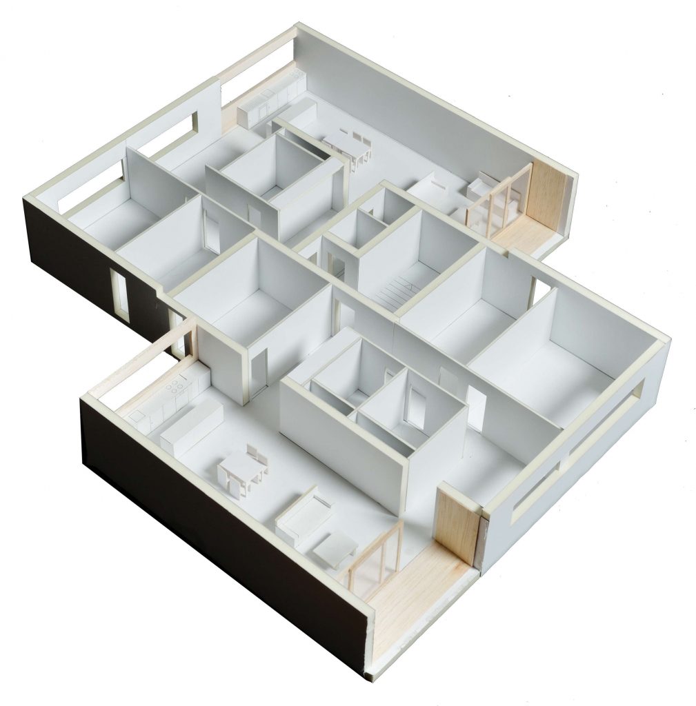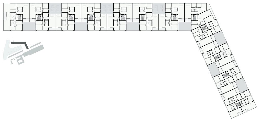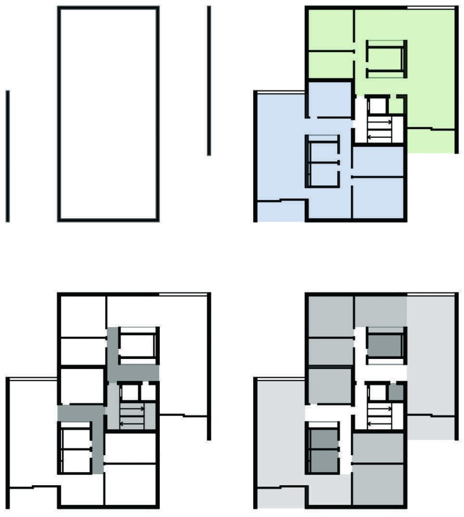 La typologie des logements se compose de deux parties. Une traversant avec le séjour et un noyau dur avec la circulation, les services et la partie nuit.
