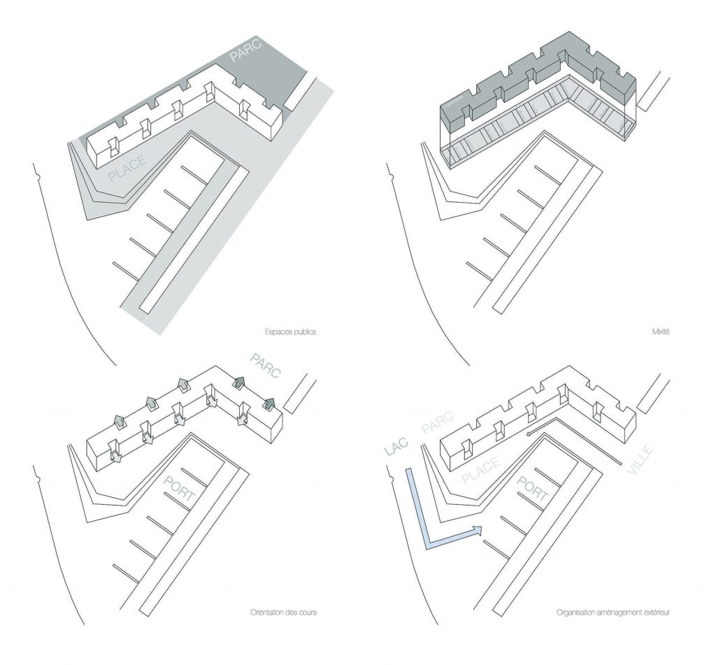 Suite à une dilatation du canal, la rive s’est déformée afin d’accueillir un port au centre d’un nouveau quartier. Le projet intègre des espaces privés ainsi que des espaces publics.